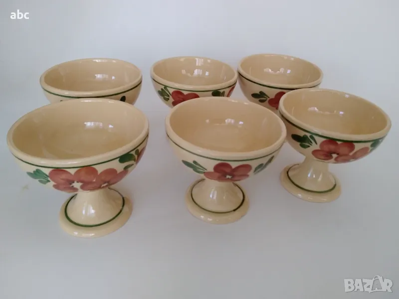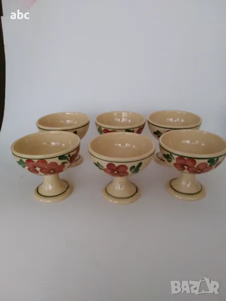 Чаши българска керамика старо производство.Стават за сладолед или разядка.Размер височина 9см отвори.5см дълбочина 4 см.Само лично предаване.На една от чашките има малка почти невидима забележка затова и цената е съобразена с нея.