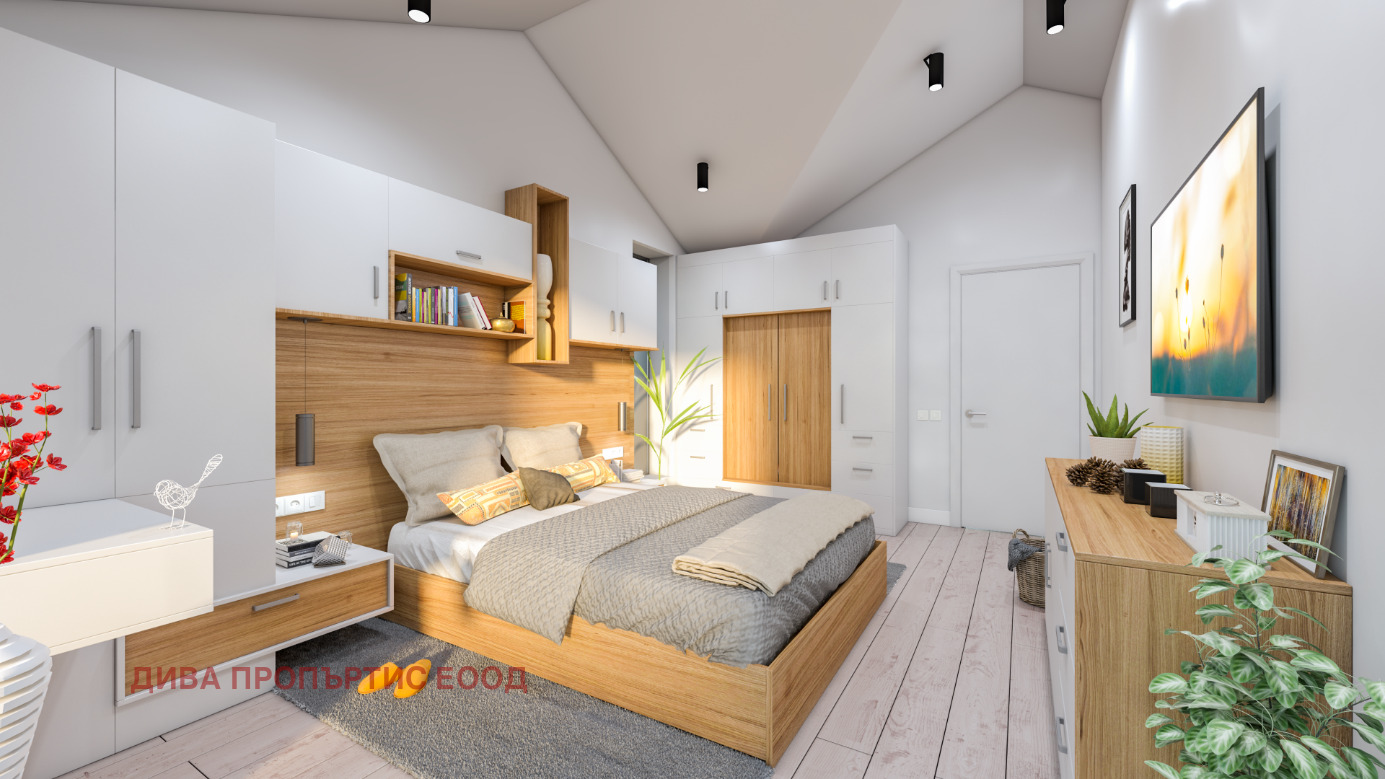 На втория етаж са разположени: спалня със собствен санитарен възел и дрешник, две спални, мокро помещение; санитарен възел; лоджия;