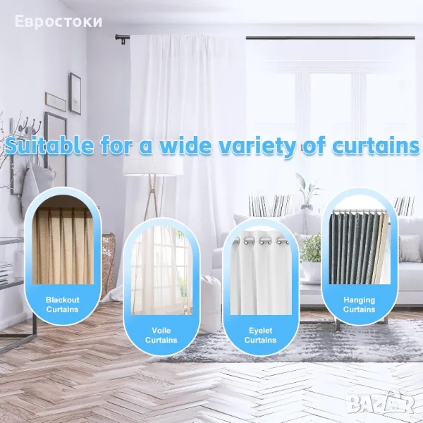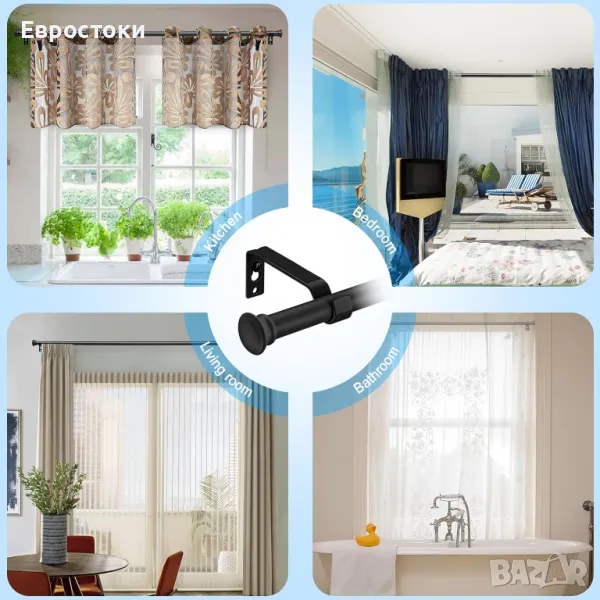Напълно регулируеми чрез премахване/добавяне на секции, тези 76 – 116 см корнизи за завеси могат да се разширяват, за да паснат на различни размери на прозорци.