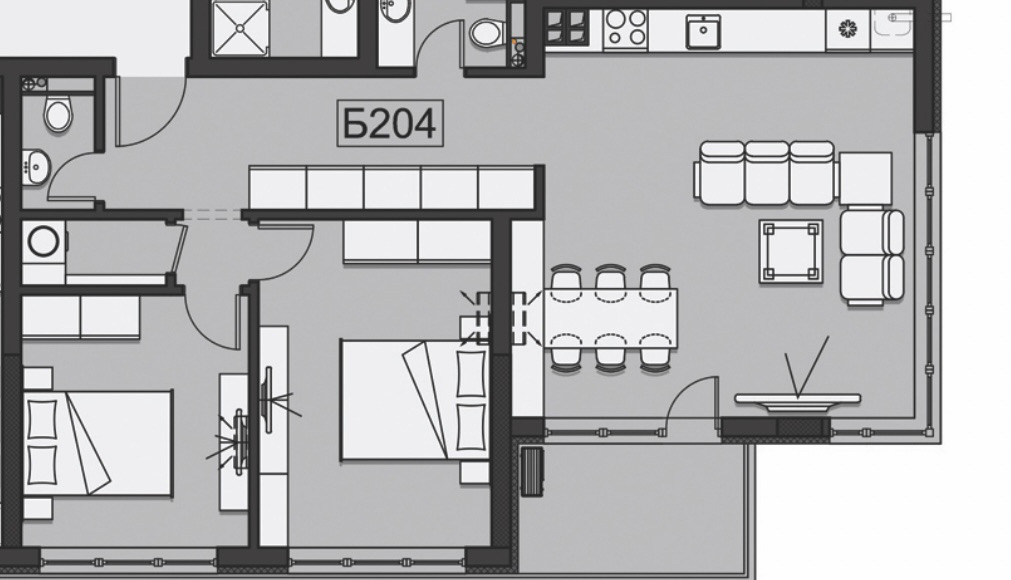 Разполага с две големи спални,просторна кухня с всекидневна,две бани и мокро помещение. Отоплително захранване от индивидуални кондензационни газови котли и оборудване на всеки апартамент със самостоятелен отоплителен колекторен възел.