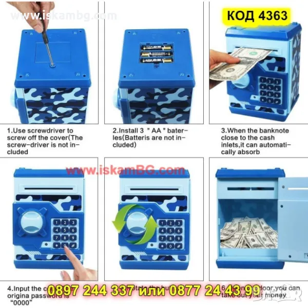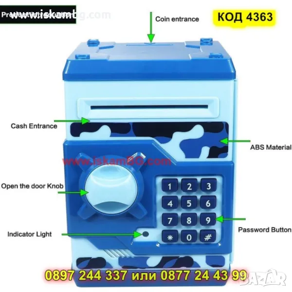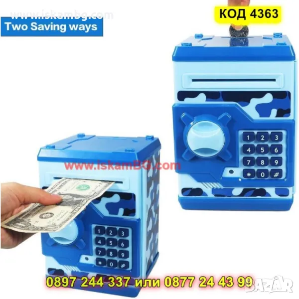 Интерактивна касичка, която учи децата на спестяване по забавен начин. Оборудвана е с четирицифрен ПИН код за сигурност и автоматично прибиране на банкноти.