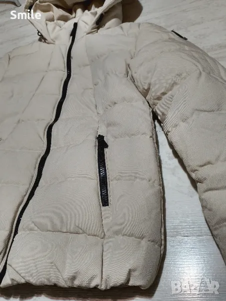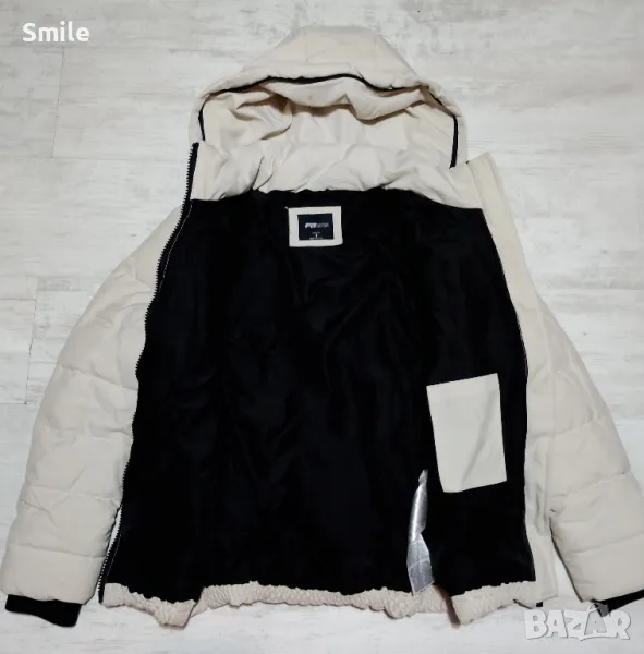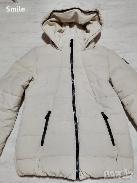 Дамско зимно топло яке FB SISTER В отлично състояние, без никакви забележки. Не е носено, обличано веднъж. Има два джоба отпред с цип. Цветът е мръсно бял. Размер S. Размери, измерени от мен: ширина от подмишниците в закопчан вид - 48 см., дължина - 62 см., дължина на ръкав + рамо - 70-71 см., дължина на ръкав от мишница - 45-47 см. Изпращам със "Спиди" или с "Еконт".