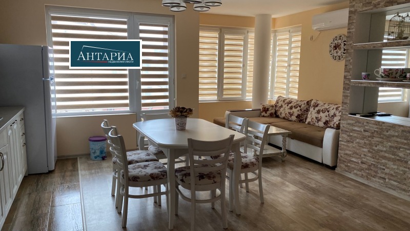Стилен двустаен апартамент с паркомясто в нова сграда без такса поддръжка, близо до плажа и центъра на града. Апартаментът е на трети етаж и с югоизточно изложение, разпределението е удобно и функционално, то включва Г- образен коридор, просторно отворено пространство, разделено в светла и слънчева дневна с трапезария и кухненски бокс, зона за спане (спалня), има баня с тоалетна и балкон с изглед към тих и поддържан двор. За довършването в апартамента са използвани качествени материали, обзавеждането е по проект, оборудването е ново.