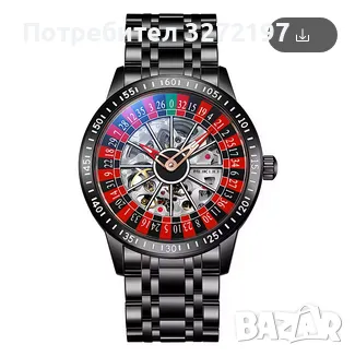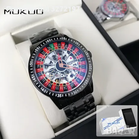 Този автоматичен механичен часовник се отличава със завладяващ дизайн на рулетно колело с червени и черни сектори, зелени числа и механични вдлъбнатини в центъра на циферблата. Дигиталната рулетка ще се върти с леко завъртане на китката и ще спре да се върти, когато китката е неподвижна. Няма бутон за управление.