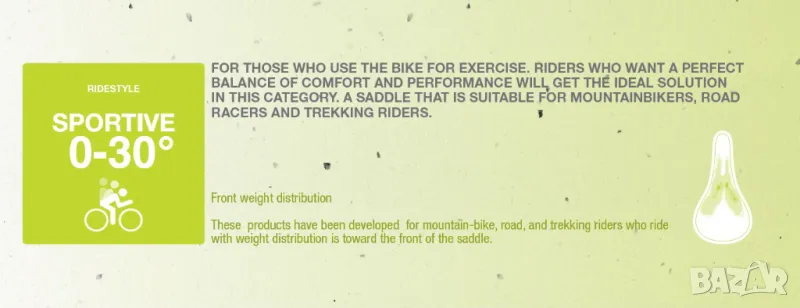 Създадено за колоездачи, които предпочитат по-агресивна позиция на каране с разпределение на тежестта напред, Sportive седлото разполага с дизайн с отвор, който облекчава натиска в перинеалната област, насърчавайки по-добър въздушен поток и намалена умора при по-дълги карания.