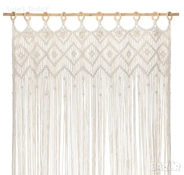 Ленти за врата, тип Перде, бежов, макраме, Комарник, 100x200см Перде за врата макраме с дебела памучна корда, горен дизайн 25см, дълги ресни 75см, дървени мъниста и пришити дървени халки Ø6см (диаметър на вътрешната халка Ø4см). Заедно с дървената пръчка Ø2cmx1m, на която можете да закачите пердето.