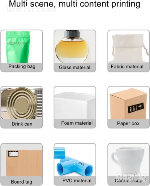 Материал за печат: Картон, пластмаса, дърво, тръба, камък, кабел, промишлени опаковки, медицинска храна