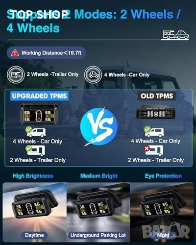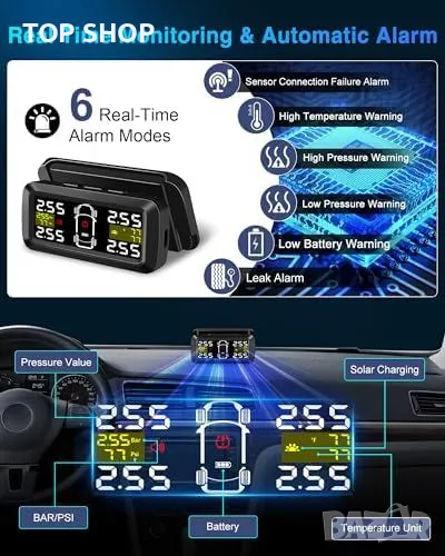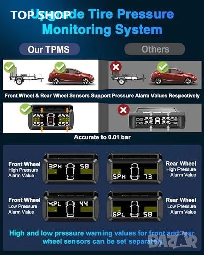 Универсална Система за Мониторинг на Налягането в Гумите: Подходяща за 2 или 4 колела. Точност до 0.01bar, с индивидуални настройки за аларма за високо/ниско налягане на предните и задните гуми.