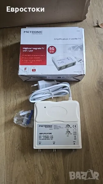 Metronic 414113 - VHF/UHF вътрешен телевизионен усилвател за DTT с LTE филтър, 5G съвместим, VHF 25 dB, UHF 30 dB, регулируемо усилване, 1 вход/2 изхода тип F, бял