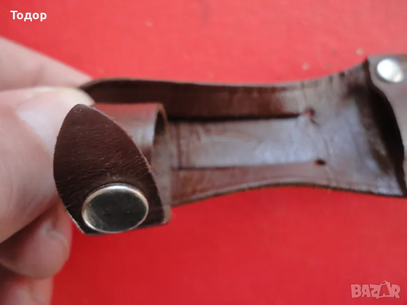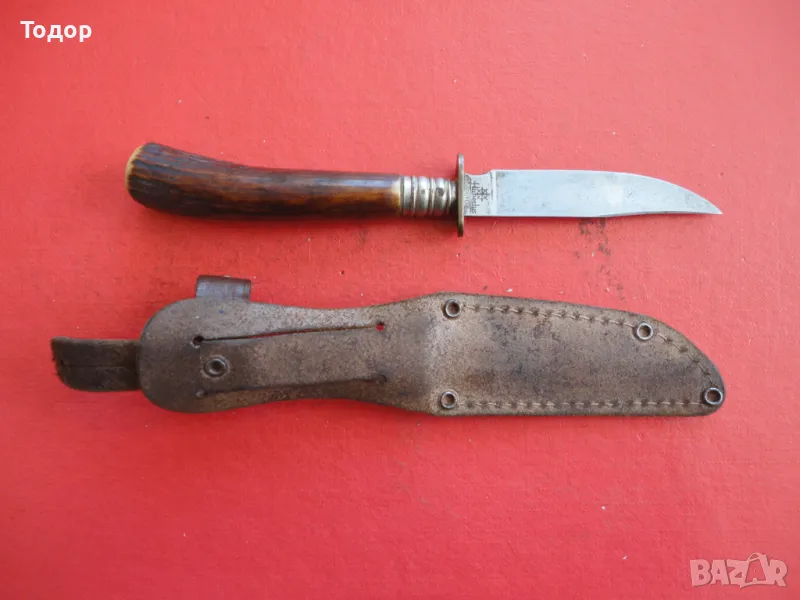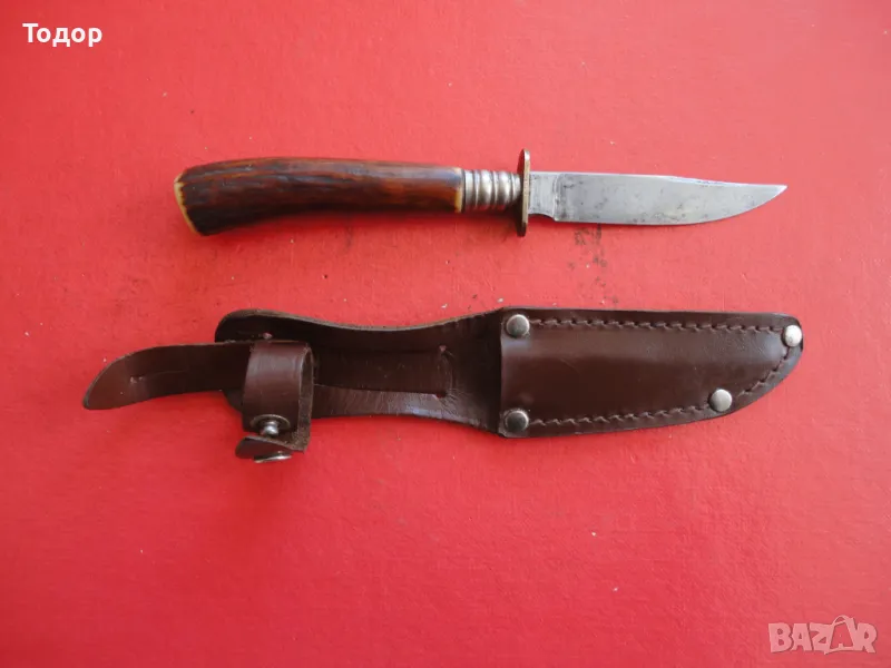 Страхотна стара изработка Дебелина на стоманата 3,5 мм Прекрасно острие от въглеродна стомана с многобройни и ясни маркировки Дръжка от еленов рог Оригинална кания от естествена кожа Не ползван Отлично състояние