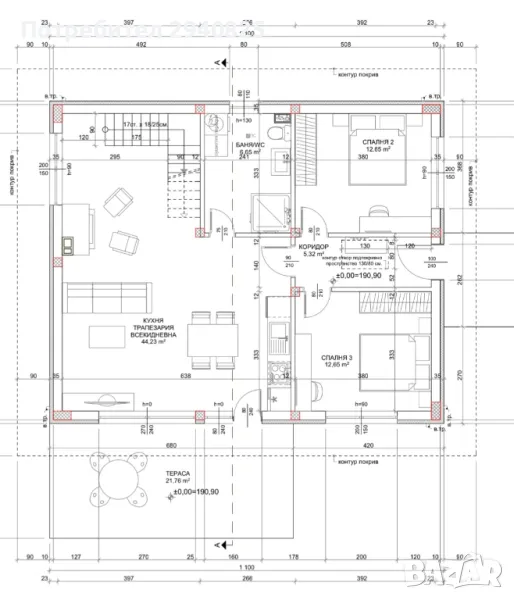 1 - ви етаж: входно антре, вътрешно стълбище към втория етаж, просторна дневна 44,23 м2 с френски прозорци и веранда от 20,54 м2. 2 еднакви спални 12.65 м2, коридор 5.32 м2 и санитарен възел баня и тоалетна 6.65 м2.