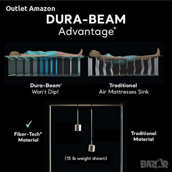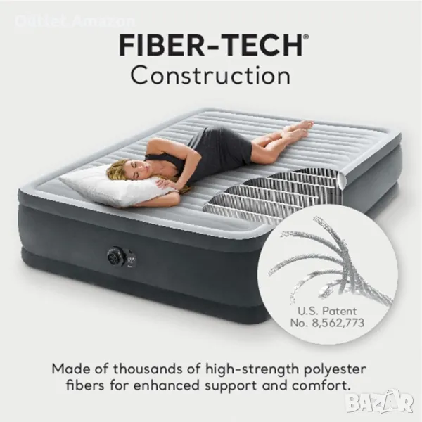 Надуваемият матрак Queen Ultra Plush Airbed на Intex от серията Dura-Beam Deluxe е предназначен за 2 души и е подходящ за ползване като допълнително или основно легло в дома или вилата ви. С него ще можете да осигурите комфортен сън на вас или вашите гостите. Изработен е от PVC по технологията Fiber-Tech, която следва извивките на тялото ви като по този начин осигурява опора, мекота и комфорт по време на сън, а горната и страничната му част са с кадифена повърхност за допълнително удобство. Също така притежава уникалната конструкция на ръба и долния пръстен за отлична стабилност и е снабден с вградена QuickFill пома за бързо и лесно надуване. Матракът се предлага в комплект с чанта за удобно съхранение и транспортиране.