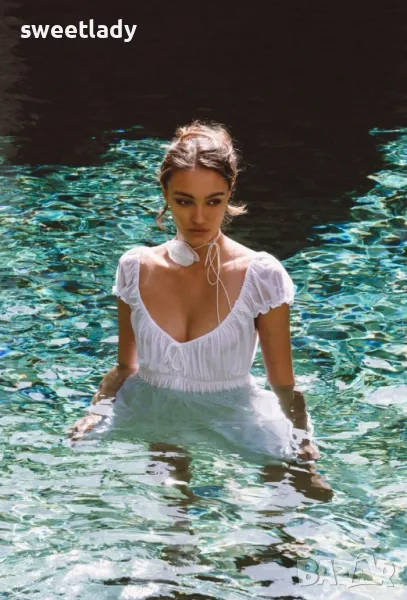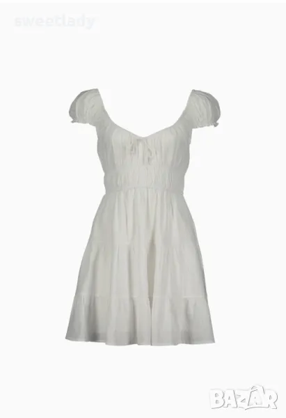 Завърши елегантната си визия по перфектен начин с атрактивна рокля със съдържание на лен.В класически бял цвят.Лятна дантелена рокля в бяло с ластична талия и волан,роклята има подплата.