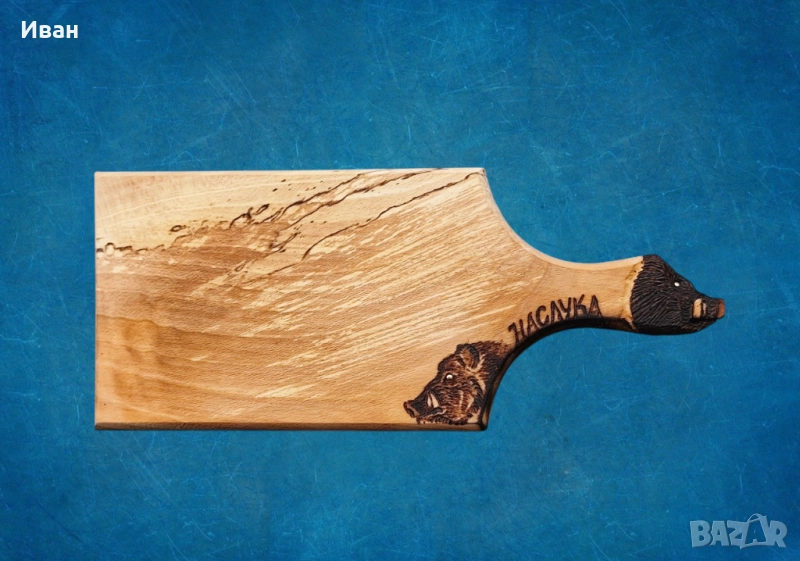 Дъска изработена от бук и украсена с пирография и резбована глава на диво прасе.