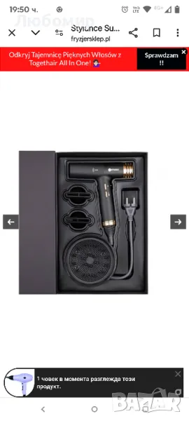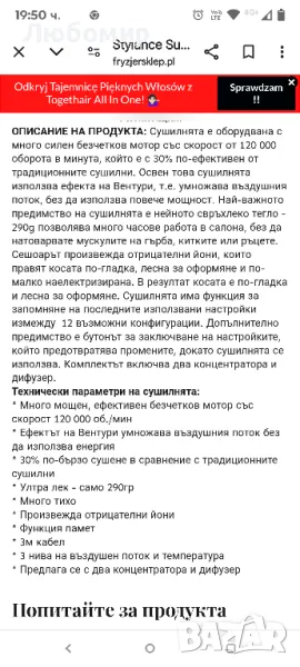 ОПИСАНИЕ НА ПРОДУКТА: Сушилнята е оборудвана с много силен безчетков мотор със скорост от 120 000 оборота в минута, който е с 30% по-ефективен от традиционните сушилни. Освен това сушилнята използва ефекта на Вентури, т.е. умножава въздушния поток, без да използва повече мощност. Най-важното предимство на сушилнята е нейното свръхлеко тегло - 290g позволява много часове работа в салона, без да натоварвате мускулите на гърба, китките или ръцете. Сешоарът произвежда отрицателни йони, които правят косата по-гладка, лесна за оформяне и по-малко наелектризирана. В резултат косата е по-гладка и лесна за оформяне. Сушилнята има функция за запомняне на последните използвани настройки измежду 12 възможни конфигурации. Допълнително предимство е бутонът за заключване на настройките, който предотвратява промените, докато сушилнята се използва. Комплектът включва два концентратора и дифузер.