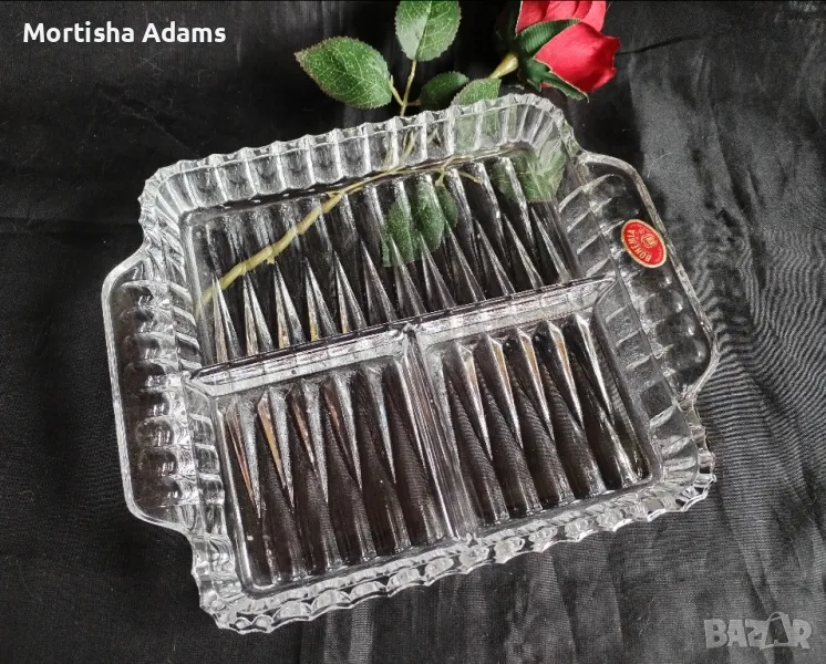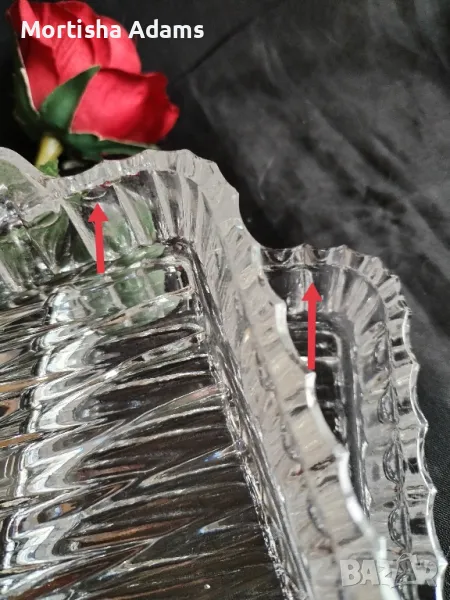 Две красиви кристални плата неупотребявани, размери 17,5/23см. с дръжките, височина 3см. Едва забележими неравности на ръбчетата, които опитах да снимам, но е доста трудно- почти не се виждат.