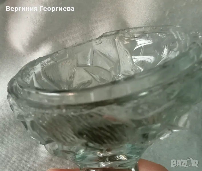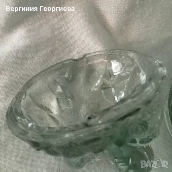 Красиво резбована захарница или бонбониера от масивно стъкло, много тежка. Предполагам и вече много рядко срещана. Имаме я, откакто се помня - края на 60 - те, началото на 70 - те години.