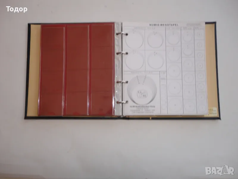 Височина 13 см Ширина 21,5 см Има 14 броя листа като всеки лист е за 12 броя монети с размери на леглата 5 на 5 см На всеки лист има щамповане маркировки Има 4 броя луксозни червени разделителя и три като карти Нов За 168 броя монети