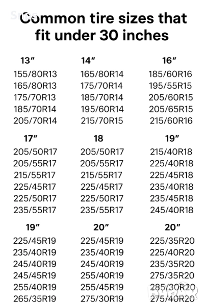 Покривалото до 30 инча е подходящо за над 80% от масовите гуми, включително всички стандартни размери за: леки автомобили,