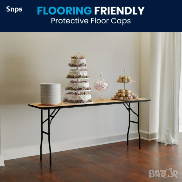 Кафяви крака на пиедестал със защитни капачки за пода се сгъват под масата