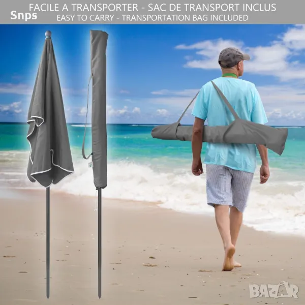 Неговата система за отваряне и затваряне с лицеви опори позволява бързо и лесно боравене. Нашият чадър може да бъде фиксиран към твърда земя или да бъде закрепен към стойка ( не се предлага ).