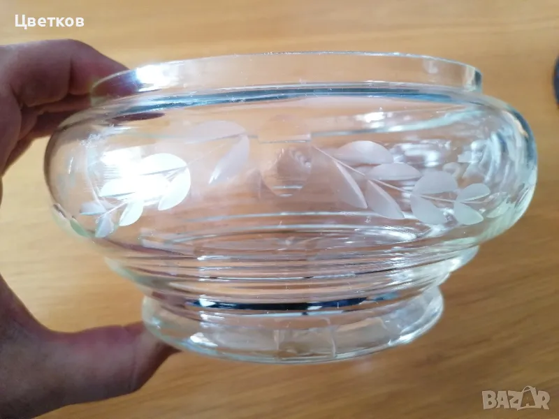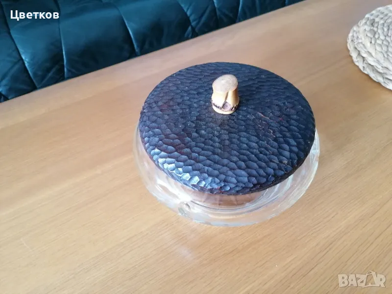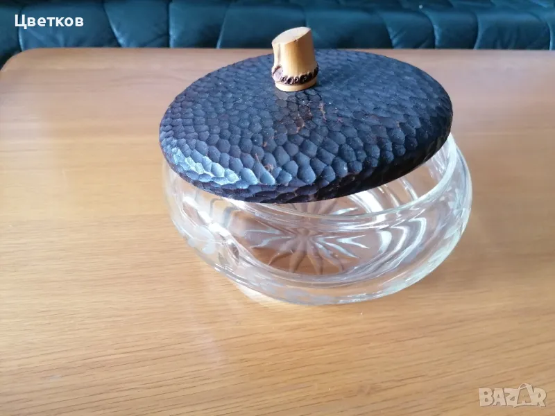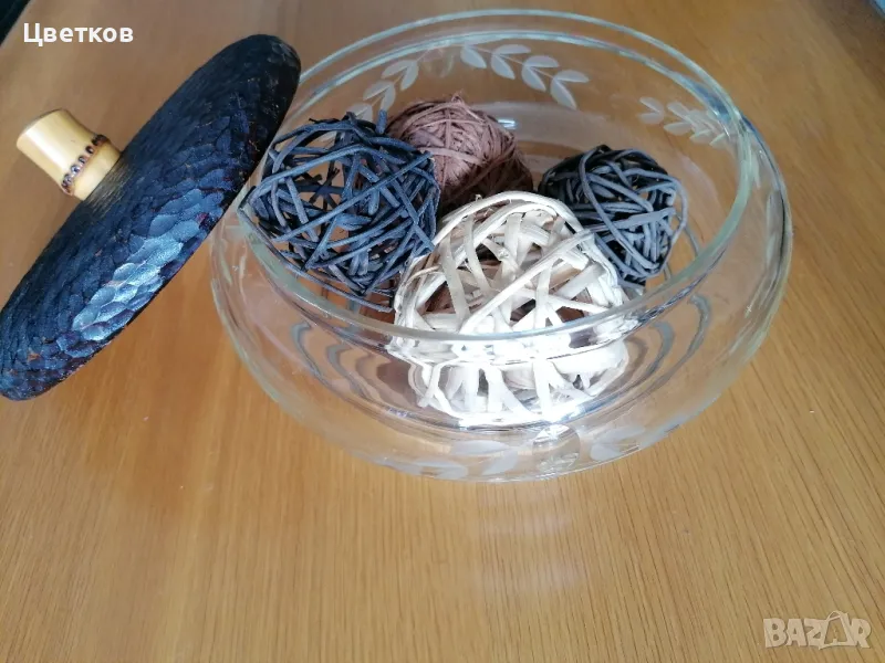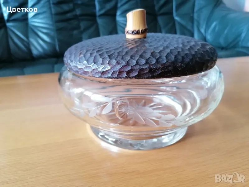 Продавам много красива стъклена гравирана купа за бонбони или бисквити с дървен капак с форма на шапка на жълъд.Прекрасна изработка,в отлично състояние,използвана.