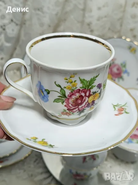 🇩🇪Schirnding 🇩🇪Сервиз за чай или кафе.Фин ,ефирен немски порцелан в ярък декор, взаимстван от Майсен.Златен кант с нотка за магия.И за настроение,чашките са с различен декор.♥️Нови парчета.-Троен сет с чашка 200млподложна чиния,десертна чиния 💥 Цена 35лв.за сет💥-Захарница цена 💥35лв.-Купа на столче цена 💥60лв.-Ваза цена 💥35лв.Сега имате възможност да съчетаете един перфектен сервиз по ваш вкус.Състояние Ново в перфектен златен кант.Опаковкам сигурно за моя сметка.