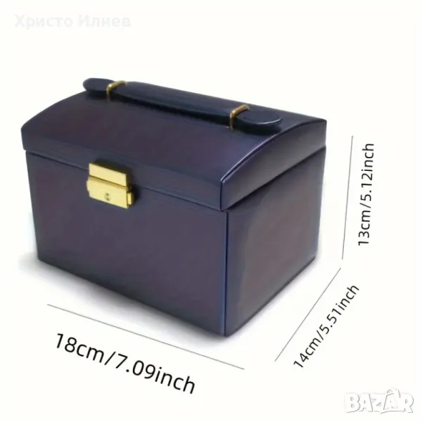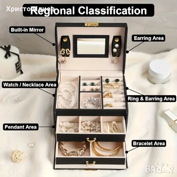 Кутията има допълнително чекмедже с удобни разделения, а капакът се заключва. След отваряне се разкрива много пространство за съхранение, както и огледалце на капака. Подходящ избор за съхраняване на часовници, гривни, пръстени, колиета и т.н.