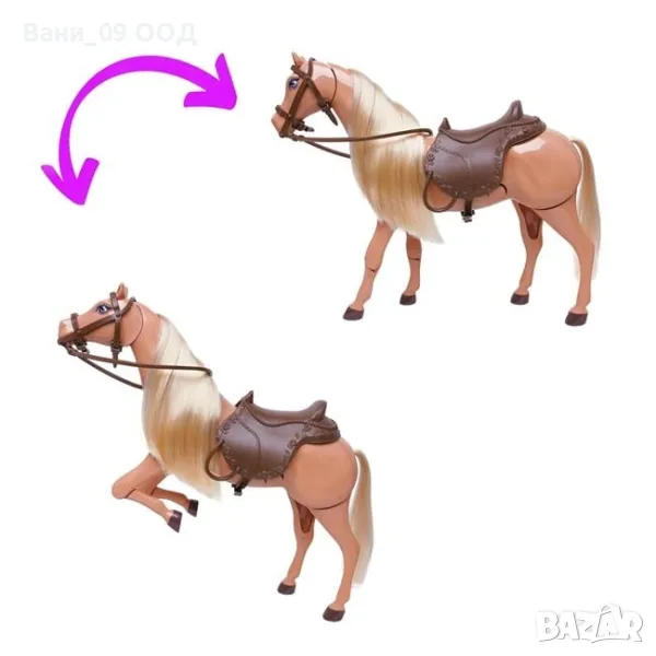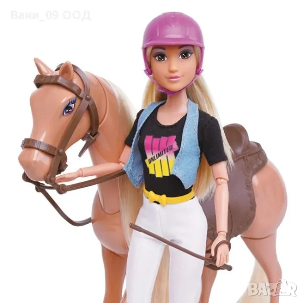 Състезателен кон с кукла ездач в униформа, каска, ботуши и слънчеви очила. Предните крака и главата на коня могат да се движат с натискане на бутона. В края на състезанието ги очаква купа.