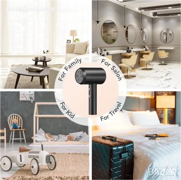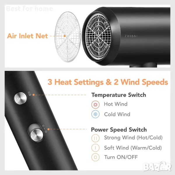 Сешоар ZHIBAI с йони, професионален сешоар с 2 температурни режима, и 1 накрайник за стилизиране, сешоар с отрицателни йони за жени, деца, дома, пътуване, салонен черен.