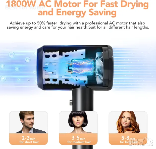 Лек материал и тих дизайн: оптимизирана и подобрена система от въздуховоди, нивото на шума е под 75 dB. Нашият сешоар осигурява приятна и тиха атмосфера. Сешоарът е лек и лесен за съхранение (тежи само 490 грама), прави ръцете ви спокойни и удобни. Лесен за носене. Идеален за пътуване и семейства.
