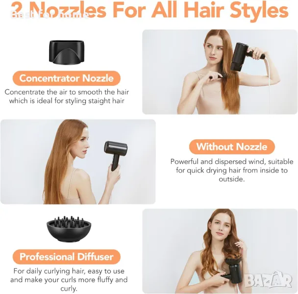 Подходящ за всички типове коса: сешоарът е снабден с стилизираща дюза, за да отговори на различни нужди за стилизиране. стилизиращата дюза отговаря на ежедневните ви нужди от изправяне и намалява къдренето.