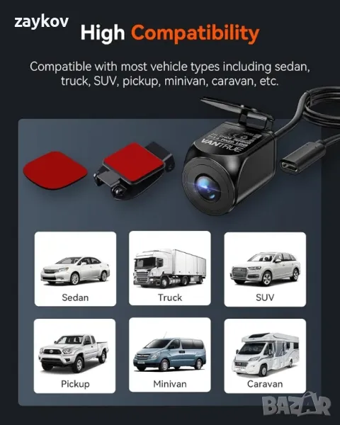 Универсална съвместимост: Проектиран да се интегрира безпроблемно с Vantrue N4 Pro, S1 Pro и E3 Dash Cams, подобрявайки вашата система за наблюдение с водоустойчиво задно виждане. Адаптивен към широка гама от модели превозни средства като камиони, SUV, седани, пикапи и RV, което го прави идеалното надграждане за ентусиастите на камерите за управление по целия свят.