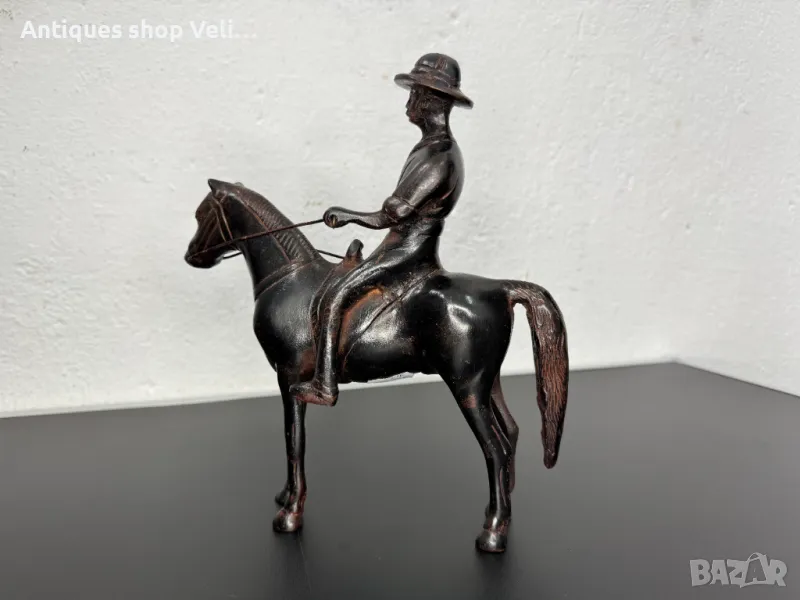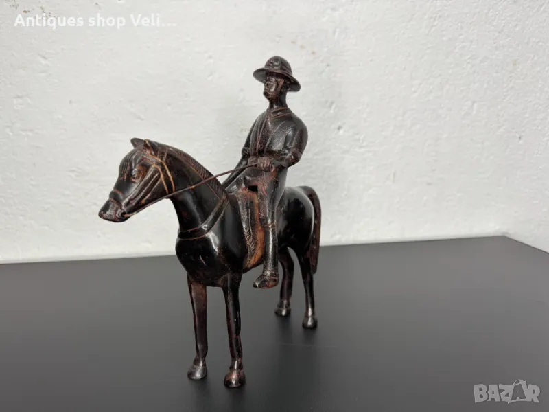 Бронзова фигура на конник. Добро състояние. Предлагаме доставка с Еконт и лично предаване за градовете Велико Търново, Русе и Сливен. Размери-26/23/9см.