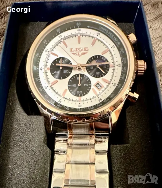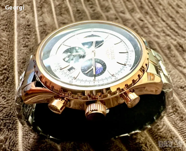 Със забележима външност и стилен характер съчетаващ млечно белият циферблат/хронограф с подчертаният релефен златен кант за допълнителна изразителност !