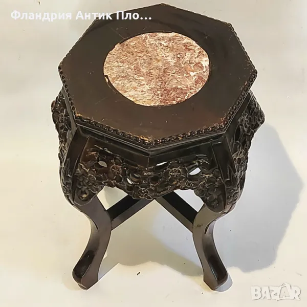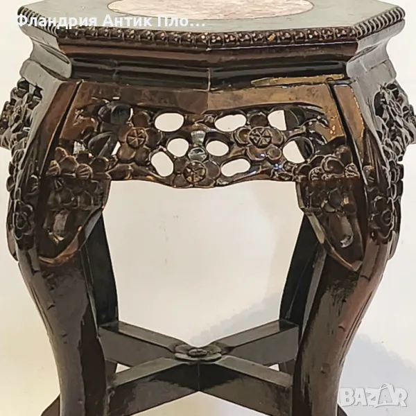 Изящна дървена поставка за цветя, богато декорирана с ръчно изрязана флорална орнаментика. Елегантните извити крака и шестоъгълният плот с инкрустиран мрамор придават на изделието изтънчен ориенталски характер. Подходяща за декорация в класически и еклектичен интериор.