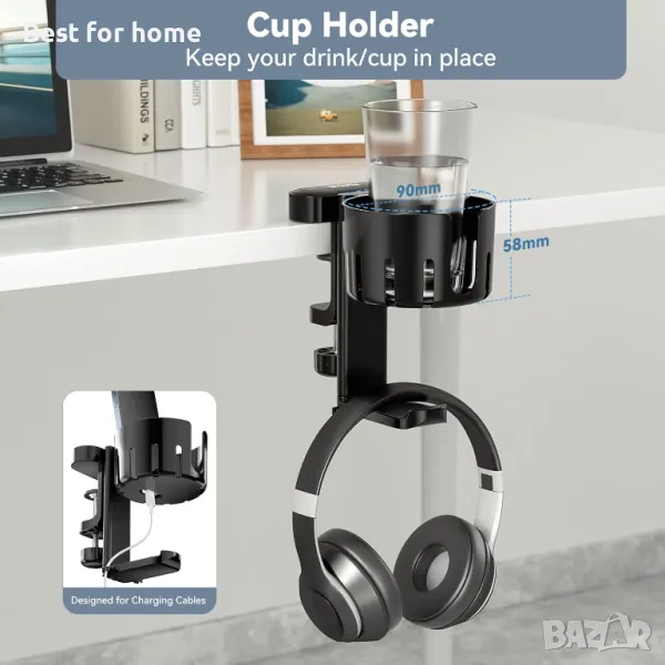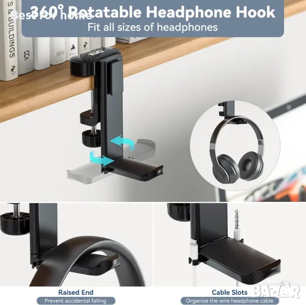 Въртене на 360° и органайзер за кабели за слушалки - Кукичката за слушалки под бюрото с организатор за кабели за слушалки, който може да управлява добре кабела на слушалките, прави вашия работен плот по-подреден. Държи кабела на вашата слушалка на място, за да го предотврати от влачене по земята или захващане между краката на стола на бюрото ви.