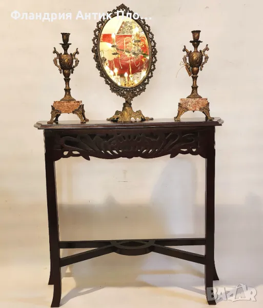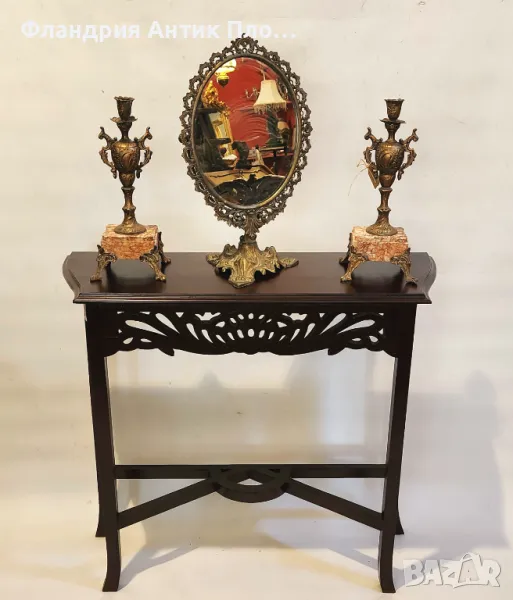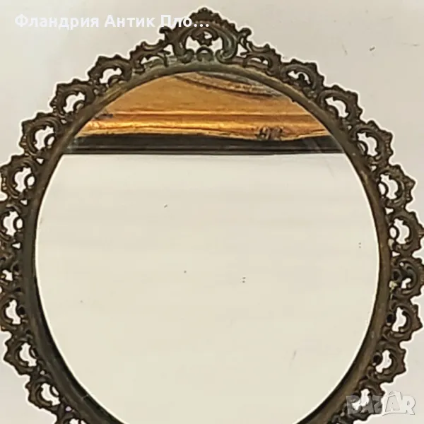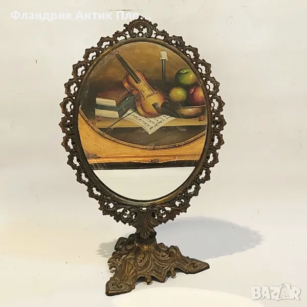 Елегантно настолно огледало с богато орнаментирана бронзова рамка и стабилна декоративна основа. Изящният ажурен дизайн, вдъхновен от бароковата стилистика, придава на огледалото изтънчен ретро чар. Компактният му размер го прави подходящо за тоалетка или като акцент в интериора.