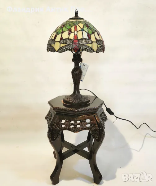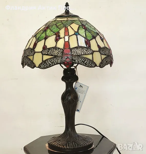 Елегантна настолна лампа, вдъхновена от стила Тифани, с ръчно изработен абажур от цветно стъкло. Дизайнът „Водно конче“ впечатлява с ярките си нюанси на жълто, зелено и червено, допълнени от декоративни стъклени елементи. Основата е изработена от метал с орнаменти, напомнящи за природните мотиви на Ар Нуво.