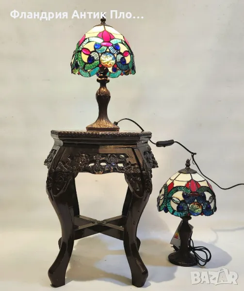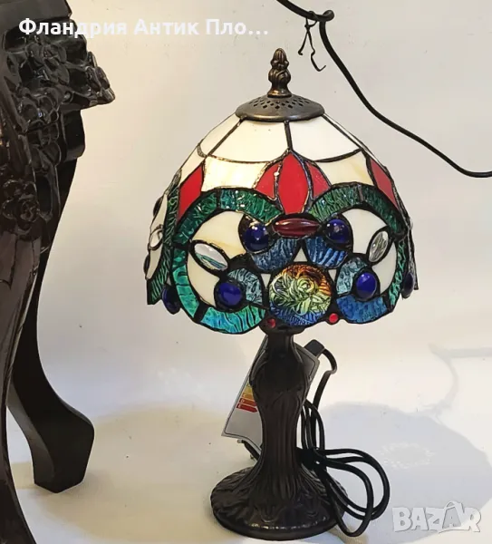 Изискана настолна лампа с ръчно изработен абажур от цветно стъкло, вдъхновен от класическите витражни орнаменти. Богатата палитра от червени, сини, зелени и кремави нюанси създава ефектно преливане на светлината. Металната основа с декоративна гравюра подчертава стила Ар Нуво.