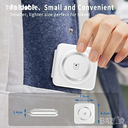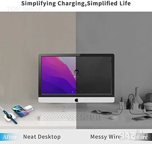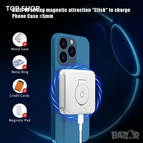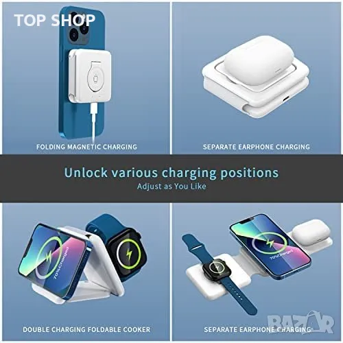 Това е безжично зарядно устройство 3 в 1, предназначено за зареждане на множество устройства, включително мобилни телефони, слушалки и часовници. Максималната му мощност е 15 W за зареждане на мобилен телефон, 3 W за зареждане на Airpods и 2,5 W за зареждане на iWatch. Зарядното устройство има сгъваем дизайн, който се трансформира в стойка за телефон, и разполага с магнитно засмукване, което държи iPhone 12/13/14 здраво. Компактният и мек силиконов материал го прави лесно за пренасяне и има множество защити за безопасност, като например защита от пренапрежение, защита от късо съединение и защита от свръхток. Безжичното зарядно устройство е съвместимо с различни устройства, включително iPhone 14/Pro/Pro Max, Samsung Galaxy S22, AirPods 2/3/Pro/Pro 2 и iWatch 2/3/4/5/6/SE/SE2/7/8 (не е съвместимо с iWatch 1).