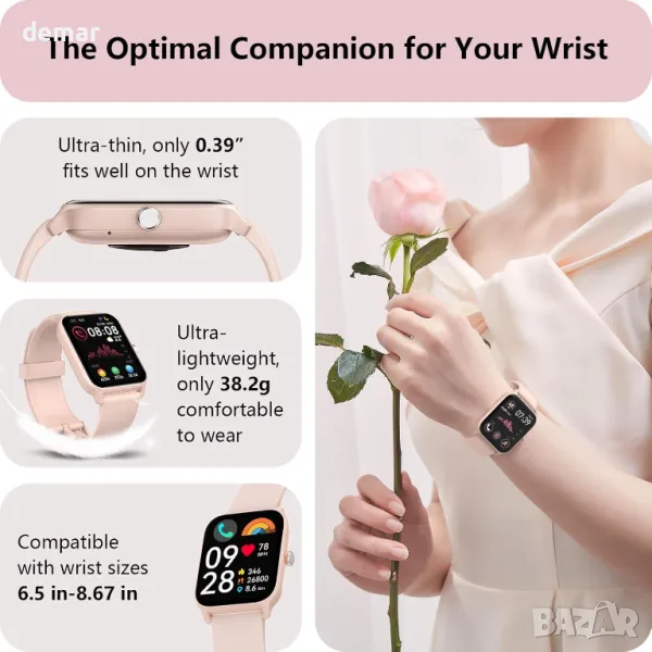 Този дамски смарт часовник разполага с обаждания по Bluetooth, известия за съобщения и вградена Alexa за гласово управление със свободни ръце. Той проследява ключови здравни показатели като кислород в кръвта, сърдечен ритъм, стрес, качество на съня и менструални цикли. С 1,8" HD сензорен екран, над 100 персонализирани циферблата и поддръжка за 100 спортни режима, той е проектиран както за стил, така и за активност. Водоустойчивостта IP68 го прави подходящ за плуване и ежедневно носене. Допълнителните функции включват контрол на камерата и музиката, актуализации за времето и настройки на алармата, с живот на батерията до 7 дни с едно зареждане. И накрая, трябва да се отбележи, че смарт часовникът е съвместим със смартфони (Android 6.0, iOS 9.0 и по-високи).