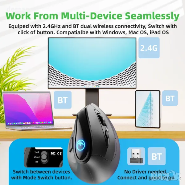 IFYOO 2.4G/BT/кабелна, трирежимна RGB акумулаторна безжична вертикална ергономична мишка G53