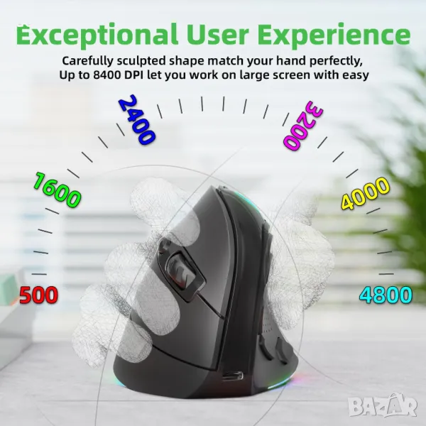 Тази вертикална ергономична мишка поддържа кабелни, 2,4 GHz и Bluetooth 5.1 връзки, което позволява лесно превключване между устройства с обхват до 10 метра. Проектиран за комфорт, той насърчава естествената позиция на ръкостискане, за да намали напрежението на китката и да помогне за предотвратяване на проблеми с карпалния тунел. Страничните бутони предлагат удобни преки пътища като навигация в уеб страници и достъп до работния плот (забележка: ограничена съвместимост на Mac и iPadOS). Той разполага с регулируеми DPI до 8400 за гладко, точно проследяване и 9 избираеми режима на RGB осветление за визуална персонализация. Мишката разполага с акумулаторна батерия с USB-C функция за зареждане и пестене на енергия. Конфигурационният софтуер работи само на Windows.