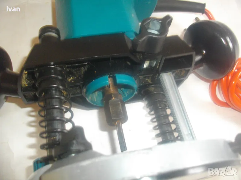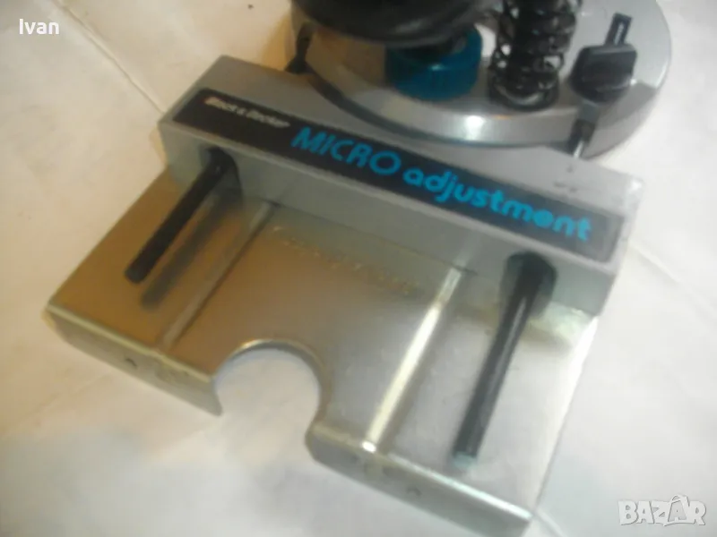 за оберфрезата, оригинален за модела - Black Decker MICRO Adjustment. Водача и плота плоча на машината са изцяло алуминиеви. Посставен в цангата оригинален прав фрезер. Работният ход на машината се смъква и двига без никакво запъване, съвсем леко и бързо. Релефен надпис на марката на лицевата страна на машината. Тегло на оберфрезата с водача - 2,2 кг.