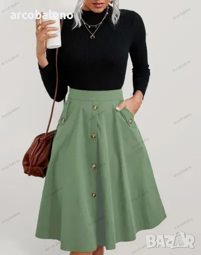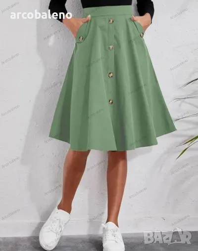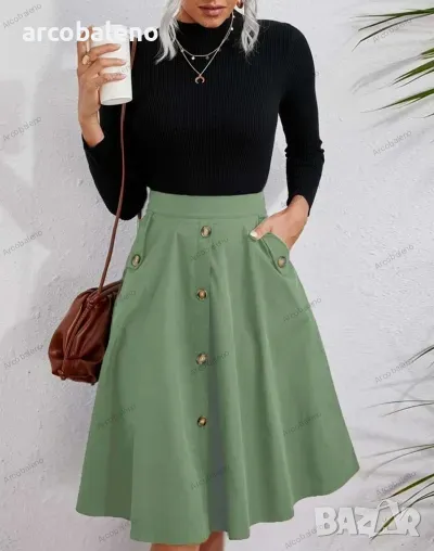 Дамска елегантна миди пола с копчета е стилна и изглежда страхотно. Материята е мека и удобна. Независимо дали е ежедневно, пазаруване, парти и т.н., може да се носи, а методът на пране може да бъде машинно или ръчно пране. Материята е устойчива на намачкване и на начупване. Размерът се измерва на ръка, като е нормално да има грешка от 1-3см.