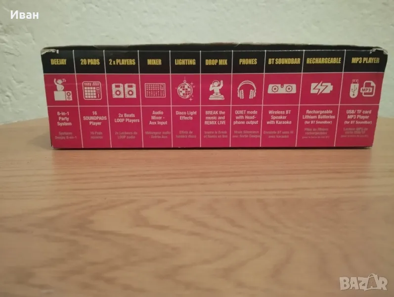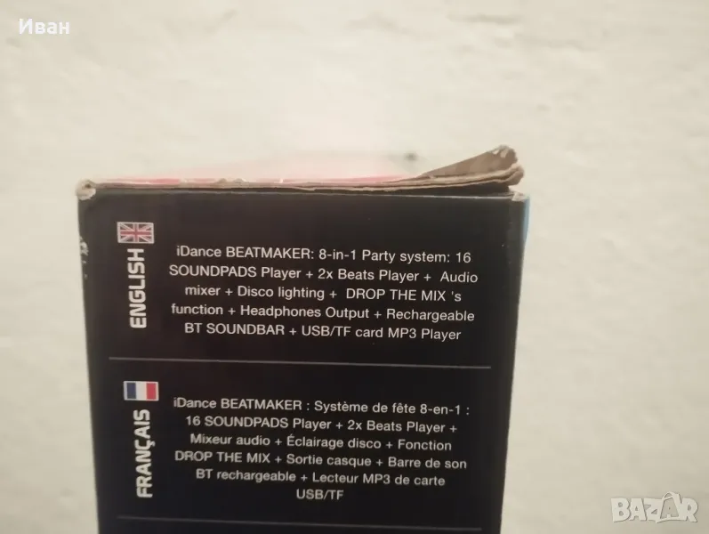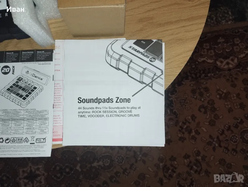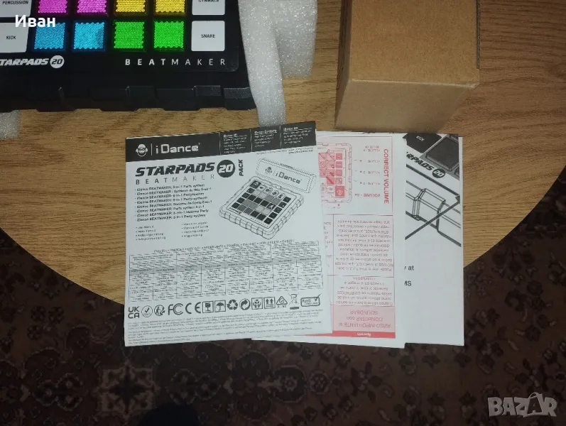 Idance starpads beatmaker .Не е използван , както се вижда и от снимките. Отворен само за реални и актуални снимки . Цена в озон - 190 лвDJ бийтмейкър от iDance! Комплектът включва бийтмейкър, саундбар, USB кабел за зареждане и аудио кабел за лесно свързване. Използвай миксера, за да създаваш бийтове и тракове с някой от включените музикални жанрове: рок, хаос, латино и електро. Експериментирай с двата плейъра, ехо ефекта и LED светлините на бутоните. Свържи бийтмейкъра и саундбара с aux кабела и включи с Bluetooth към твоя телефон, за да слушаш любимите cи песни. С чист звук и силен бас, саундбара е компактен и лек за купон по всяко време. Стани професионален DJ, създавай мелодии и се забавлявай с музикалните продукти от iDance!Технически характеристики - бийтмейкър:20 бутона с LED светлини;Няма вграден говорител;Тип батерия: 3 x AA (не са включени в комплекта);Размери: 210 х 190 х 32 мм;Тегло: 0.35 кг.Технически характеристики - саундбар:Размер на говорителя: 52 мм;Време за зареждане: 2-4 h;Време на работа: 2-4 h;Размери: 260 x 60 x 70 мм;Тегло: 0.44 кг.