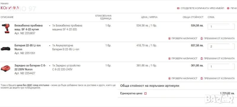 Магазинската цена на комплекта е: 1 733лв БЕЗ ДДС (С ДДСТО е 2 079лв.)