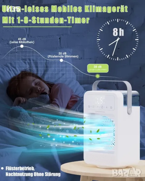 1-8 часа. Таймер и цветни LED светлини: Този мобилен климатик има функция за таймер, която ви позволява да го използвате от 1 до 8 часа. и когато настъпи зададеното време, устройството автоматично ще се изключи, което улеснява ежедневната употреба. Цветната LED нощна лампа може да създаде романтична атмосфера, когато се използва през нощта. При най-ниска скорост на вятъра звукът на устройството е под 30 dB, което няма да пречи на работата или съня ви.