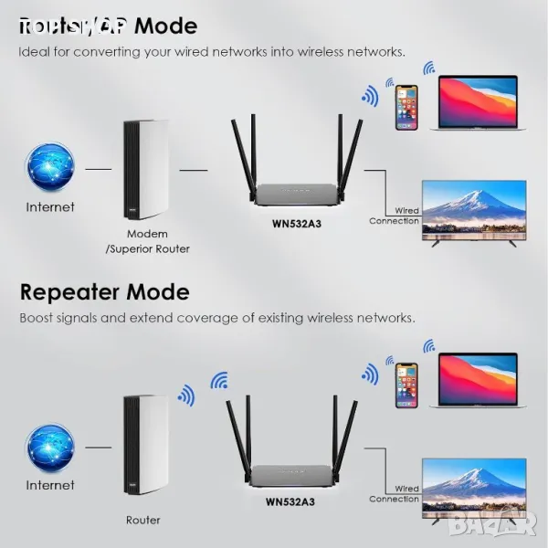 Този рутер използва технологията WiFi 5, за да осигури впечатляващи комбинирани безжични скорости до 1200Mbps. Тази скорост гарантира плавно и безпроблемно представяне за различни онлайн дейности, като сърфиране, стрийминг и игри. Ще изпитате по-ниска латентност и по-бързо време за реакция, което го прави идеален за онлайн игри и видео разговори. Рутерът работи на 2,4 GHz и 5 GHz ленти едновременно, предлагайки ви гъвкавост в начина, по който използвате вашата мрежа. Честотната лента от 2,4 GHz е подходяща за ежедневни задачи като уеб сърфиране и имейл, докато честотната лента от 5 GHz е идеална за дейности с висока честотна лента като стрийминг, игри и прехвърляне на големи файлове. Този рутер поддържа три режима на работа—рутер, точка за достъп (AP) и повторител. В режим на рутер той функционира като стандартен безжичен рутер. В режим AP може да преобразува вашата съществуваща кабелна мрежа в безжична. В режим на повторител той разширява обхвата на вашата съществуваща безжична мрежа, подобрявайки покритието, особено в райони със слаб сигнал. Оборудван с четири 5dBi многопосочни антени, този рутер осигурява обширно покритие до 140 квадратни метра. Усъвършенстваната технология за формиране на лъчи осигурява силни и надеждни връзки във вашия дом или офис, позволявайки на множество устройства да останат свързани едновременно. Настройката на този рутер е лесна, благодарение на неговия прост уеб базиран интерфейс и удобни за потребителя инструкции. Не се нуждаете от усъвършенствани технически умения, за да го стартирате. Освен това той идва с интуитивна страница за управление, която ви позволява лесно да наблюдавате мрежовите връзки.